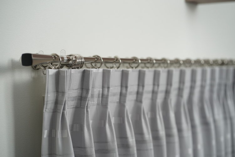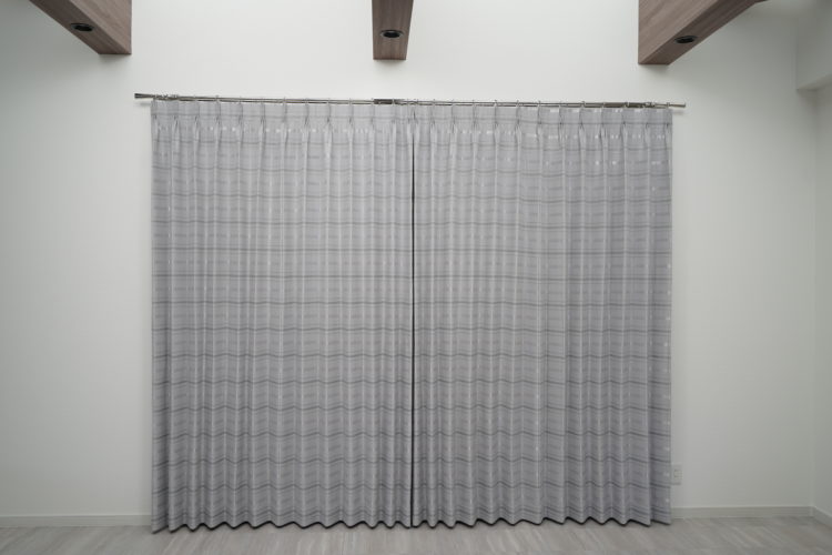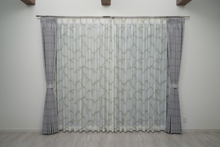 ボーダー柄のドレープカーテンにオーバル柄のレースカーテンの組み合わせ