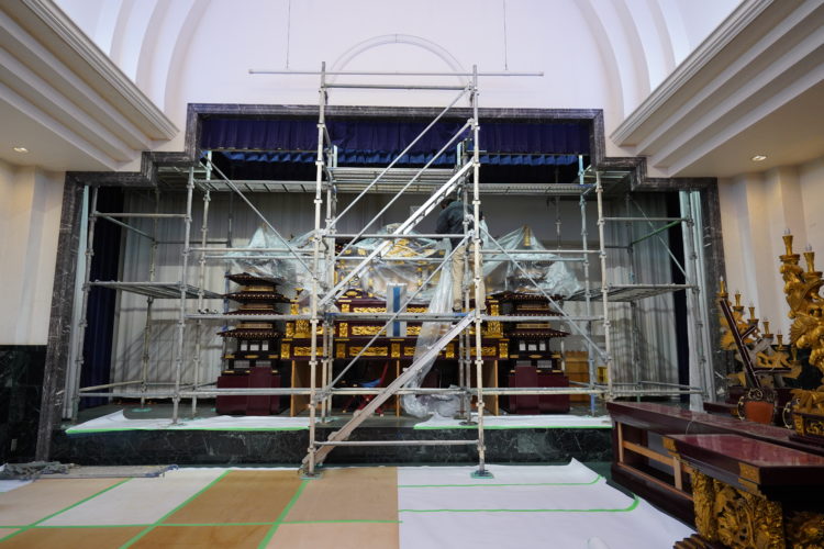 高さがありますので足場を掛けて、祭壇を養生してからの作業です
