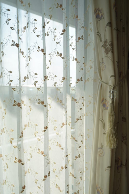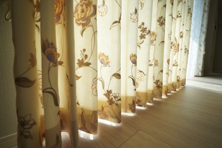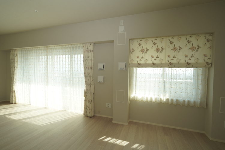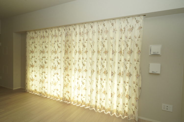 リビングの掃出しは両開きのドレープカーテン、シアーカーテン