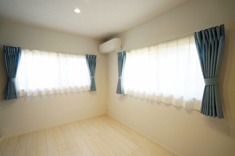 腰高窓2箇所ともドレープレースの両開きスタイル