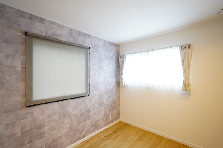腰高窓はドレープレースの両開きスタイル、アクセント壁面の突き出し窓はロールスクリーン