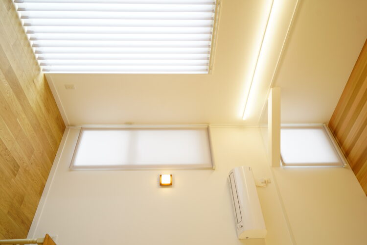 掃き出し窓は枠内に縦型ブラインドセンターレーススタイル、上下窓と吹抜け上部のFIXは縦型ブラインドと同じ生地でロールスクリーンを正面付けに