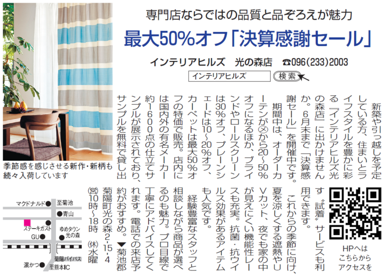 インテリアヒルズでは、「決算感謝セール」開催中です