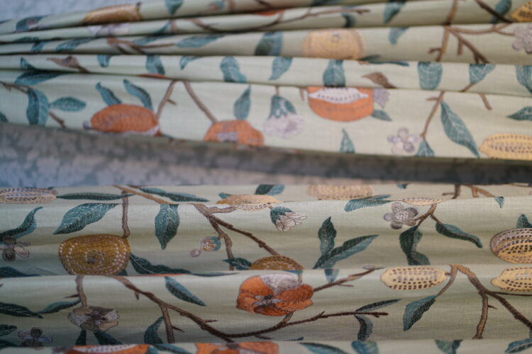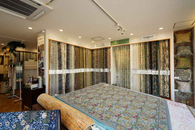 マナトレーディング、川島織物セルコンに加えて新作発表されたリリカラ、サンゲツの全4メーカーのモリスデザインカーテンを展示してます