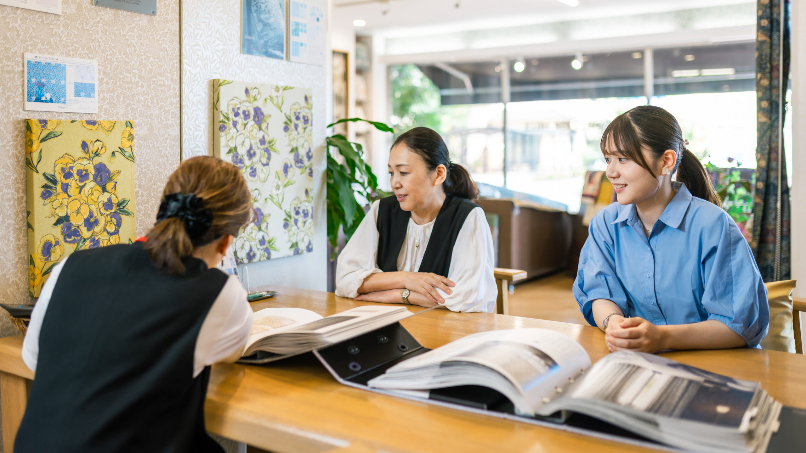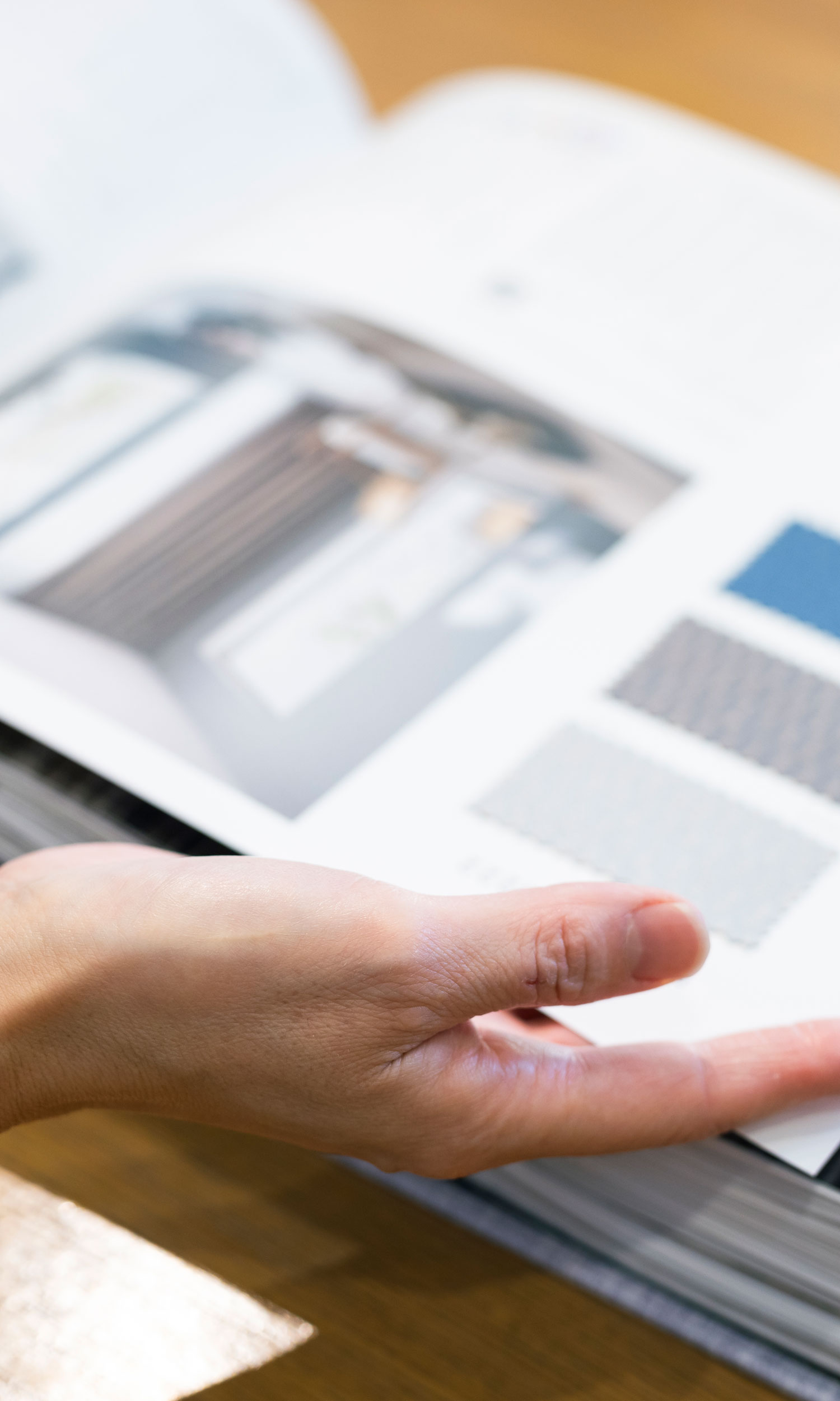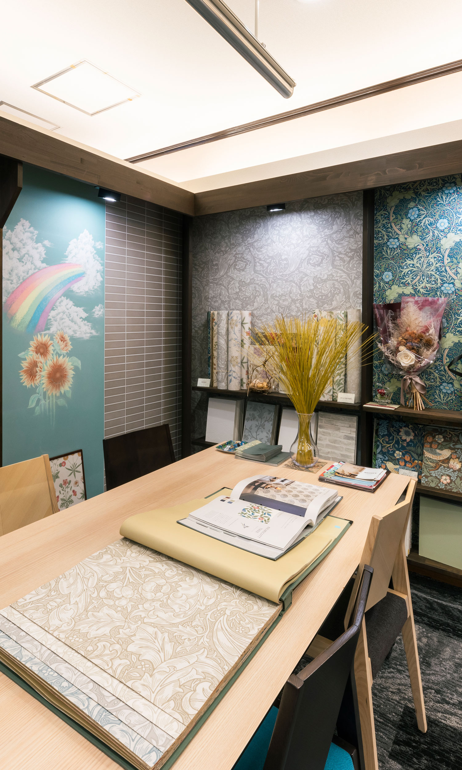 クロス(壁紙)選びのポイントは、「部屋の用途」「デザインの好み」「機能性」「予算」など、いくつかの観点からバランスよく考えることが大切です。クロスは色数や種類が豊富で、消臭、吸放湿性といった様々な機能をもった商品も多いので、その中から決めるのはなかなか難しいと思います。そういった場合には、私達専門家にお手伝いさせて下さい。 クロス選びで大切なことは、実際のシチュエーションに近い状況を作りイメージを描き易くする事なので、アドバイスをしながら数を絞り込み、大きめのサンプルを取り寄せて見比べていただく様にしています。